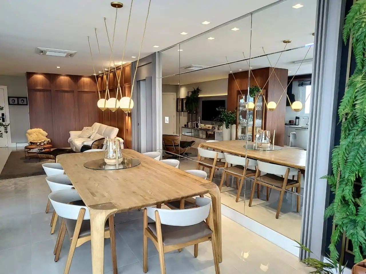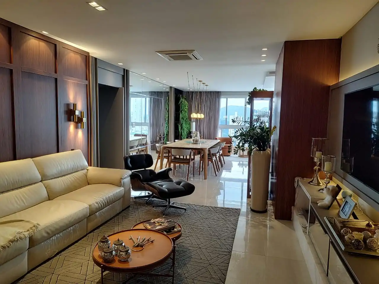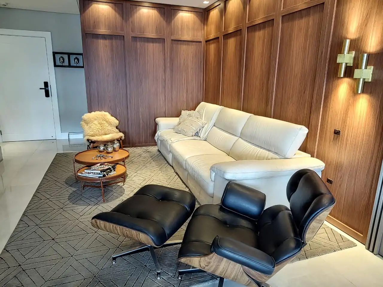 • Decoração de muito bom gosto com madeira nas paredes da sala de estar.